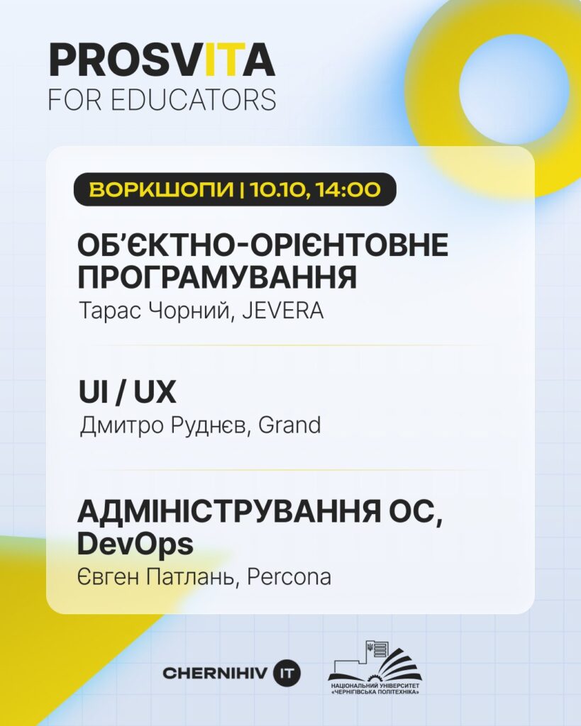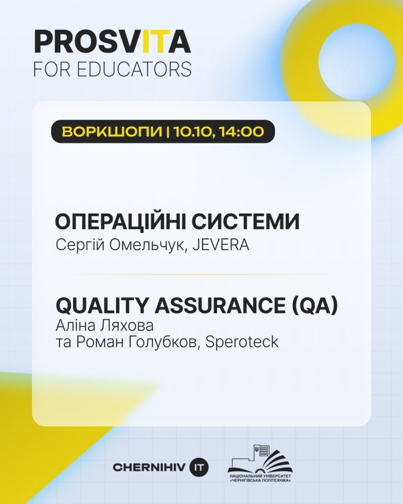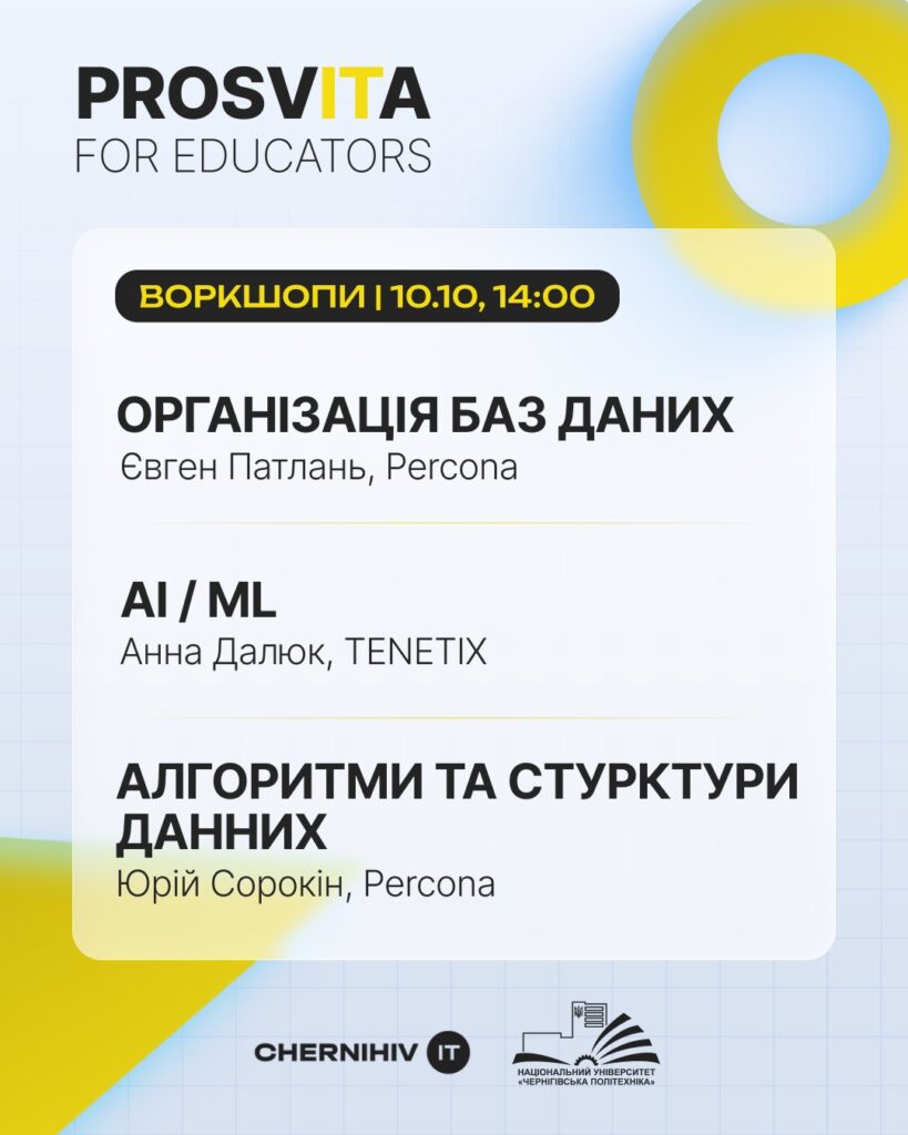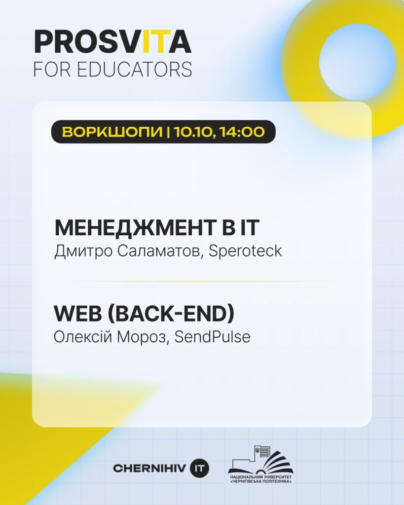 9–10 жовтня викладачі нашої кафедри долучилися до дводенного освітнього заходу ProsvITa for Educators, організованого для поглиблення співпраці між представниками бізнесу та викладачами НУ «Чернігівська політехніка». Метою програми стало обговорення актуальних тенденцій ІТ-сфери та отримання рекомендацій щодо вдосконалення освітніх програм.